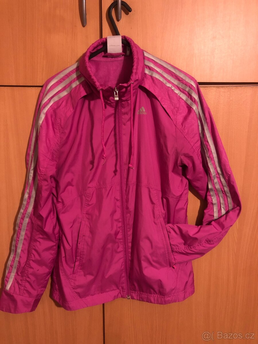Šusťáková slabá bunda-větrovka značky Adidas Climalite. Na několika místech drobné flíčky (viz foto). Velikost 34, sedí i na 36.