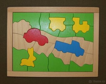 Dřevěná vkládačka, skládačka autíčka a vláčekTéměř nepoužívaná dřevěná vkládačka, skládačka autíčka a vláček.