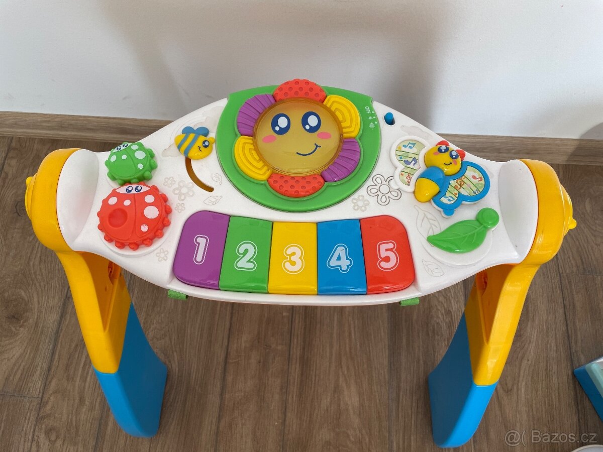 Prodím hudební stolek, v případně zašlu zásilkovnou popis: Barevný stolek, který dokáže doprovázet dítko od jeho narození až po dny, kdy se batolí a stoupá si. Pokud je miminko malé a leží na zádíčkách, může být stoleček hrazdičkou. Pokud děťátko sedí dá se využít jako nízký stoleček, pokud stojí přizpůsobit jako stoleček vyvýšený. Zvukové efekty stolečku upoutávají pozornost děťátka, rozvíjí tak jeho smyslové vnímání a jeho motoriku.