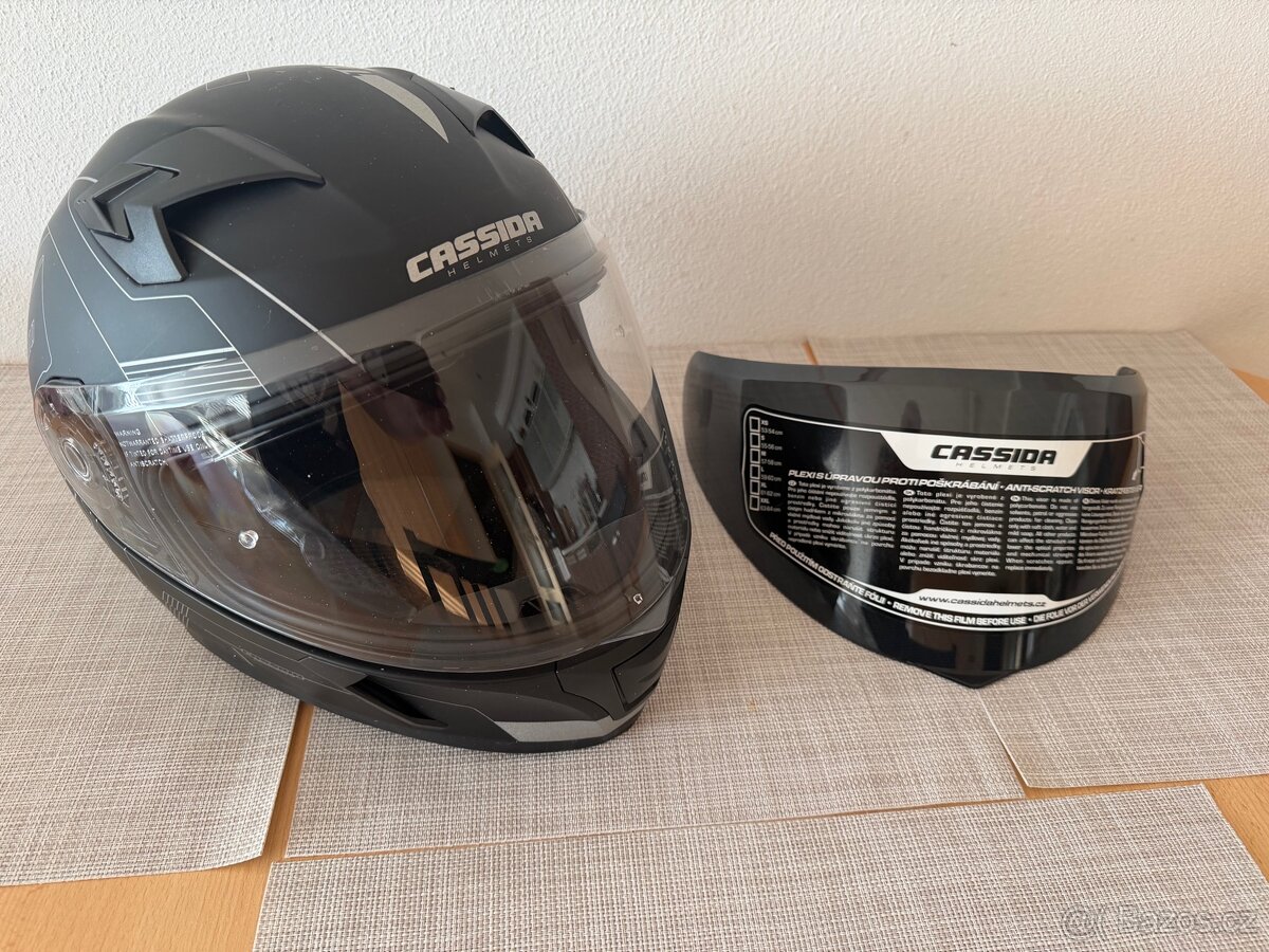 Prodám moto přilbu Cassida Integral 3.0 Turbohead - černá matná, sluneční clona, velikost L (59-60), včetně nepoužitého tmavého plexi. V hezkém stavu (samozřejmě pár škrábanců od kamínků se najde) Důvod prodeje: nevyužité Preferuji osobní předání. info z netu: Moto přilba Cassida Integral 3.0 Turbohead je integrální helma pro jízdu na silničních a cestovních motocyklech od legendární české značky. Pyšní se atraktivním tvarem, grafikou a svěžím designem. Pevná skořepina z polykarbonátu zajišťuje vysoký standard bezpečnosti, což potvrzuje i splnění normy ECE 22-05. Helma je vybavena odnímatelným nosním i bradovým deflektorem a praktickou sluneční clonou, vhodnou při jízdě proti slunci. Potěší i přítomnost náhradních hledí včetně zatmaveného přímo v balení. To vše doplňuje možnost instalace Pinlock® folie na předpřipravené piny. Technický popis: polykarbonátová skořepina sluneční clona příprava pro Pinlock® folii atraktivní grafika komfortní, plně odnímatelná a pratelná výstelka