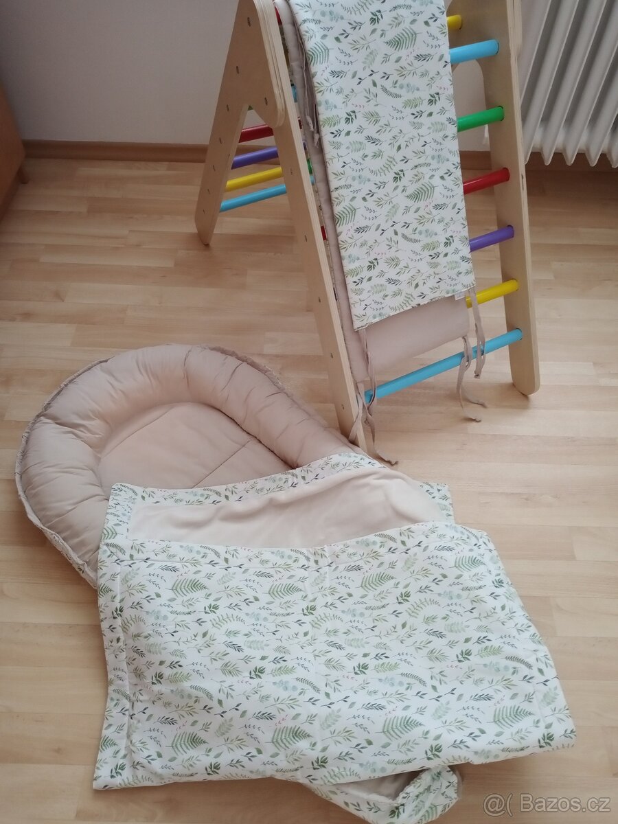 Hnízdo, mantinel do postýlky a krásná dečka.Pridam ještě dvě zavinovačky.