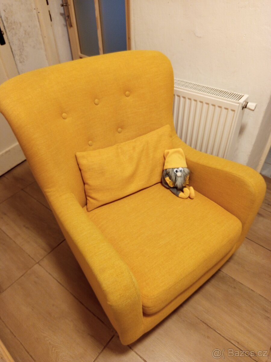 Žlutý čalouněný ušák. S bukovými nožkami. Vlastní odvoz, neposílám.