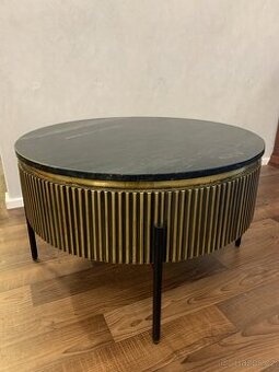 Prodám luxusní kulatý konferenční stolek o průměru 70 cm s luxusní černou mramorovou deskou a bronzovým laťovým tělem z masivního mangového dřeva. Designově jedinečný kousek vhodný do interiérů v Art-Deco stylu. ➡️ Stolek je vystavený kus ze showroomu a má drobné poškození (stav viz foto). 📍 Lokalita: Praha 4 - Nusle Pro více informací pište nebo volejte.