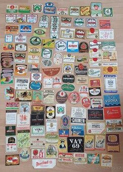 Prodám etikety od cca 60. let do roku max. 2010. Na fotce vystaveno asi 130 kusů, dalších asi 200 na fotce v krabici. Plus zadovky a krčky a 3 papírové retro podtácky. Předání v Praze, Žatci nebo dle domluvy.