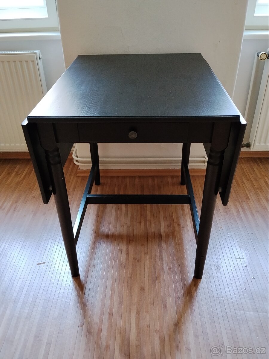 Černý dřevěný rozkládací stůl. Rozměry 69/98/127x50. Výška 74,5cm. Povrchové vady viz foto, především na levé straně skápěcí desky. K vyzvednutí co nejdříve, Praha 5 - Anděl. Prosím SMS.