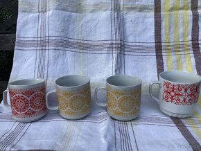 Cena: Dohodou. Pěkné staré hrnky, dva žluté jeden červený vzor mandala a jeden jiný