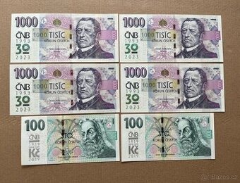 Bankovky 100 Kč s přetiskem 2019, 1. série M01 + M09; 1000 Kč s přetiskem 2023, série R73, R90, postupka 2x, R96 poslední série, cena za komplet,stav N pokud nejaky set bude prodam inzerat vymaži.