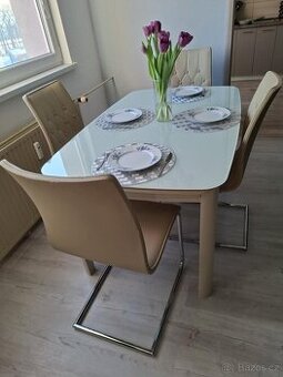 Nabízím tento jidelni stůl pevny,kovové nohy,bezpečnostní tlusté mlecne sklo,možné rozložit.my ho nikdy neměli rozložený.pouze osobní odběr.rozmery,délka: 140 cm,šířka 90 cm,výška 75 cm.rozlozeny delka: 200 cm,bez židlí.barva nohou cappuccino