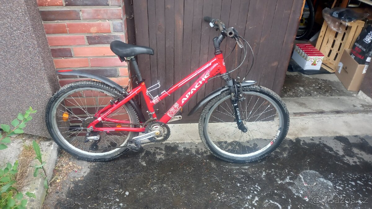 Prodám dětské horske kolo apache červené barvy s odpruženou vydlicí capa, prevody 3×7, shimano acera,pro deti od 6 do 12 let.