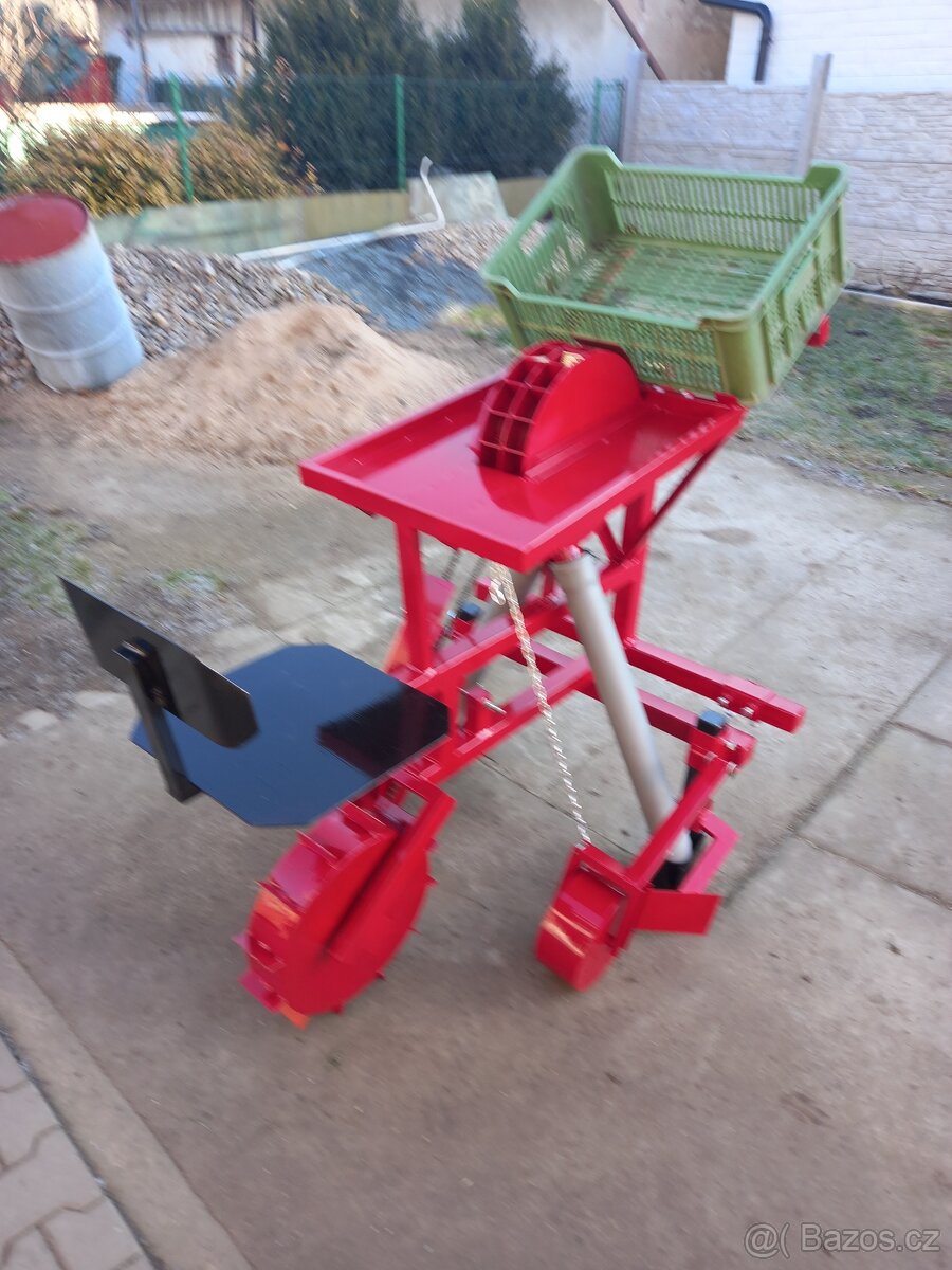 Sazeč je dvouřádkový s nastavitelným:-zapojení za traktor,-vzdálenost mezi řádky 20 až 70cm,-vzdálenost dopadu cibulovin 6-7-8-9-10 nebo 12-14-16-18-20cm.Dále je k tomu možné po dohodě výroby pomocný rám pro sázení 3 nebo 4 řádků v jedné stopě traktoru.