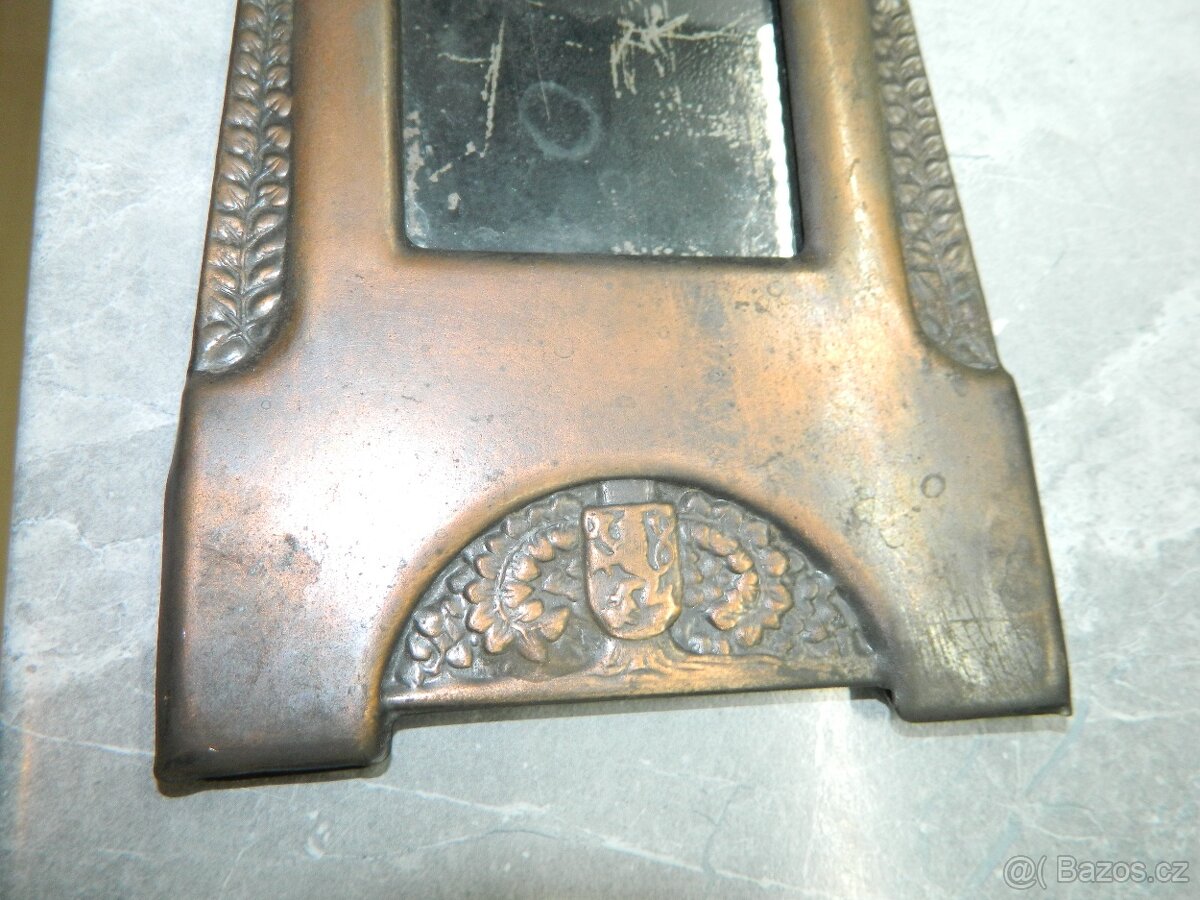 Prodám starý z přední strany asi měděný a ze zadní strany plechový pěkný rámeček značeny nápisem:VE PROSP.INVAL.LEGION.Na přední straně je Karluv most s Pražským hradem v pozadí a na spodní strane znak český lev.Délka:12,2cm,výška:20,7cm.U rámečku chybí zadní podpěrná nožka na postavení.