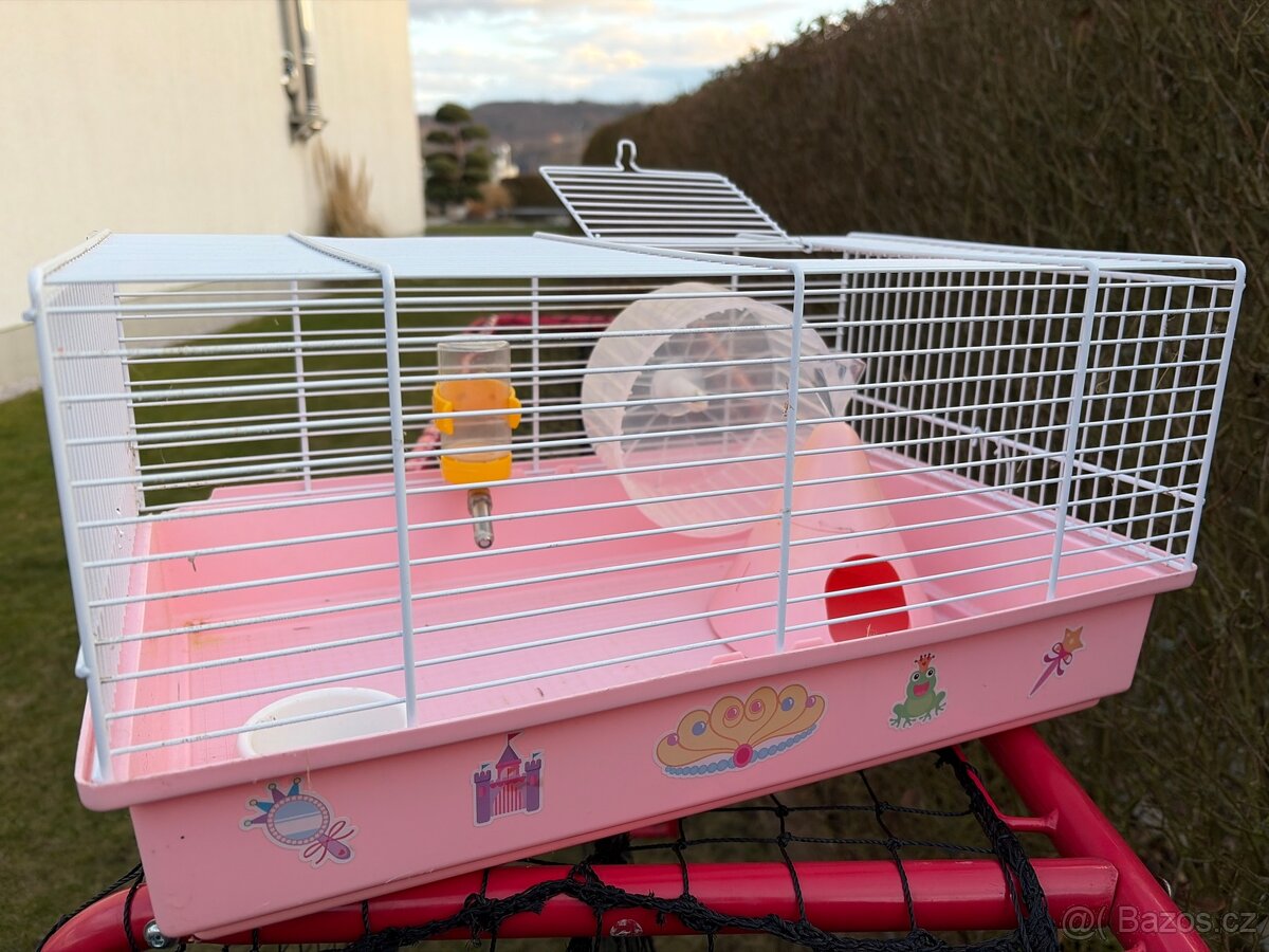 Prodám klec na křečka, šíře 45x3 hloubka 30x výška 23 cm. V ceně : napáječka, kolotoč, domeček, miska.