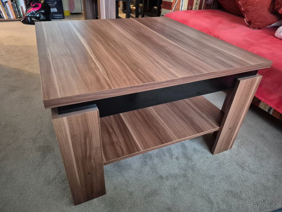 Prodam konferencni stolek. Pouzity, ale velmi dobra kvalita bez vetsiho poskozeni. Mirne odrene rohy, viz foto. Barva orech/cerny lesk. Rozmer 80x80x48 cm. Vaha cca 20kg, nelze rozlozit. Osobni predani Praha 10 - Petrovice. Podivejte se i na mou dalsi nabidku. Ve stejne barve prodavam i jidelni stul se 4 zidlemi.