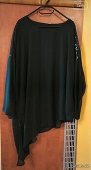 Společenská halenka se šikmým spodním lemem a filtry na ramenou , 1x použita. Barva černá. Velikost XXL/52. Rozměry: obvod hrudníku 138-140 cm, délka 56-92 cm. Výr. Janina . Cena: 199 Kč