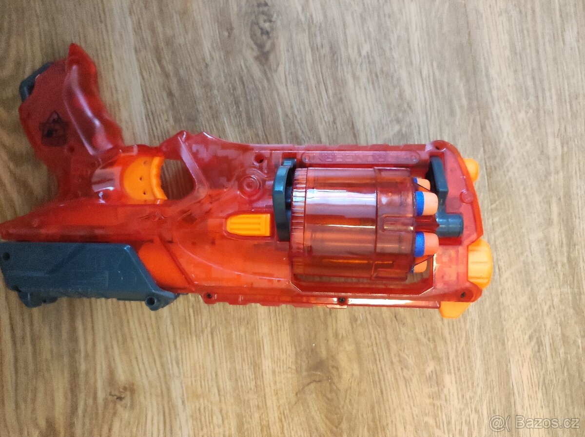 Nerf zbraň s bubnovým zásobníkem. Velice spolehlivá nikdy mě nezklamala. Stále dobře střílí. K zbrani 6 nábojů. Vzácná červená barva. Možnost odeslání. Platba převodem. Pokud máte zájem mám i jiné na výběr na profilu