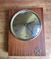 Vintage nástěnné hodiny, dřevěné, funkční, 1978, rozměry 18 x 25 cm, zlaté zdobení, skleněný kryt