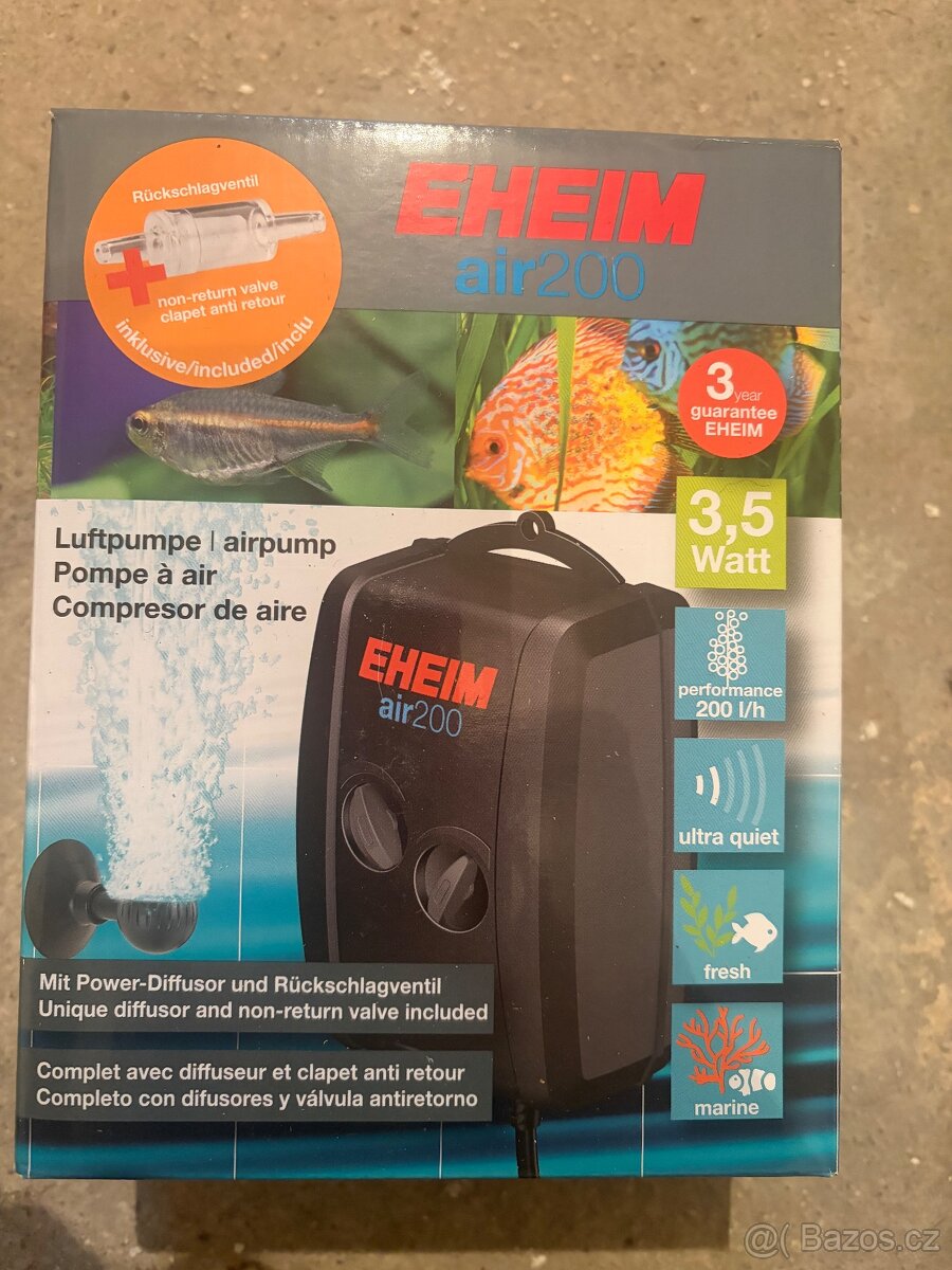 Výhody vzduchového čerpadla EHEIM: Velmi tichý provoz - Dlouhá životnost, nejlepší kvalita Průtok vzduchu je nastavitelný na každém výstupu vzduchu na zařízení - Dodatečné nastavení průtoku vzduchu a bublinového efektu pomocí difuzoru Obsahuje: difuzor: AP200, 2 m vzduchovací hadičky Gumové sací podložky pro tlumení vibrací Hák pro zavěšení vertikálně Technická data: Výkon 3,5W Šířka 8,9 cm Výška 15,2 cm Hloubka 7,1 cm Průměr vzduchovací hadičky 4 mm