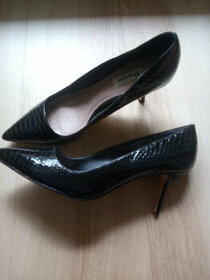 černá pravá lakovaná kůže, perforovaná, vel. 38. Výška podpatku 7,5 cm. Málo nošené.