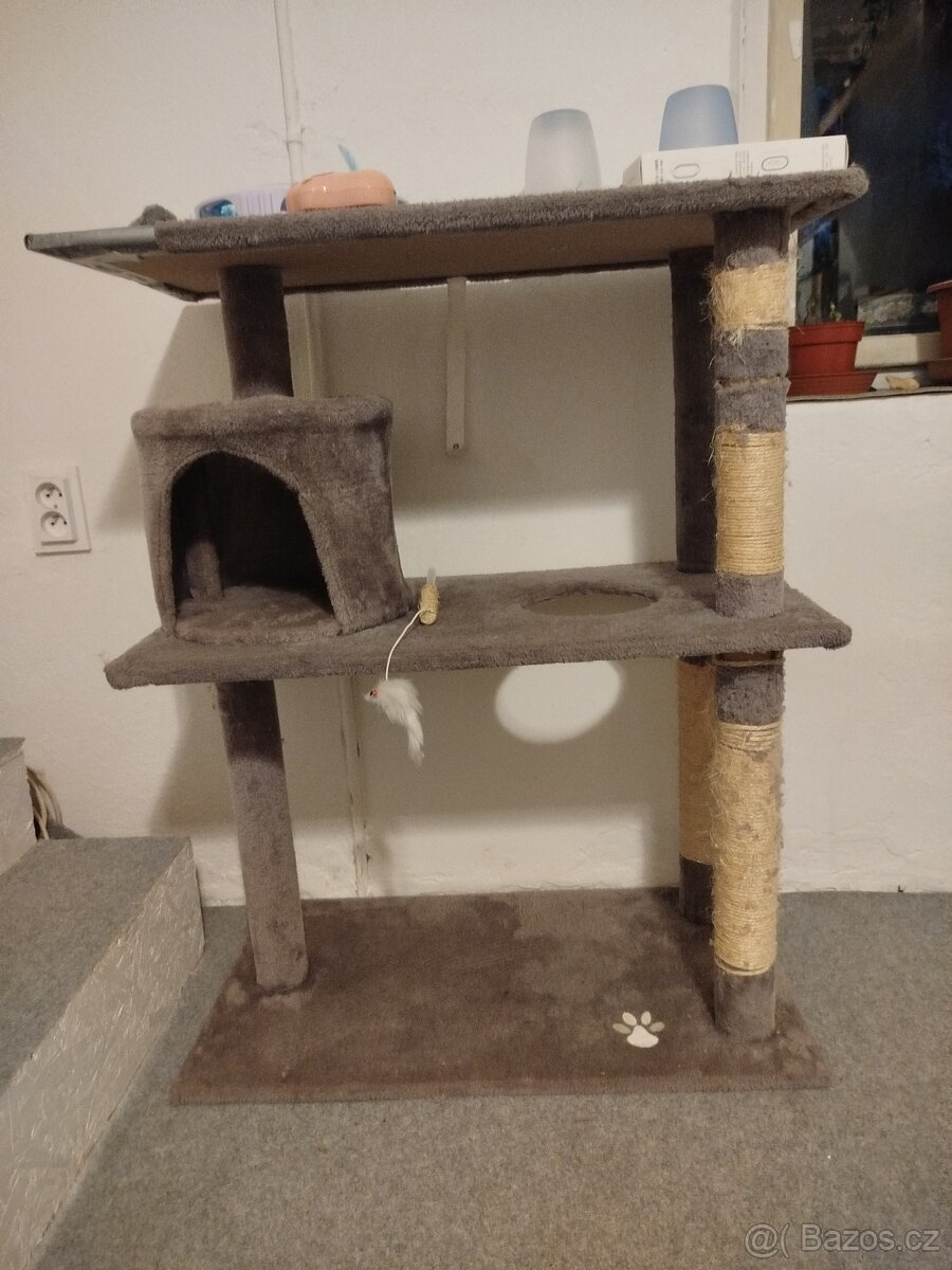 Pěkné škrabadlo pro menší kočky nebo koťátka. V 95 cm, Š 75 cm, H 40 cm. plus doplňky viz foto. S cenou za vše.