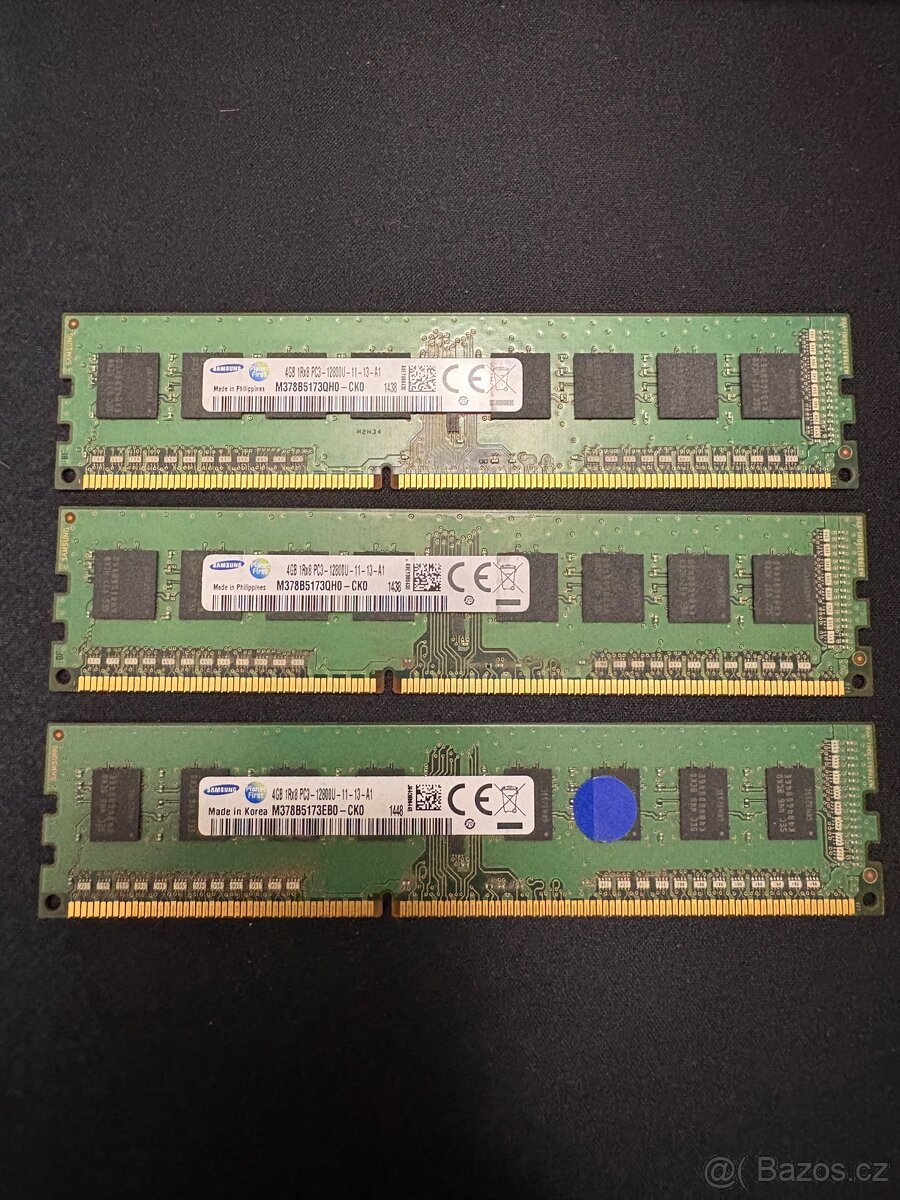 Prodám sadu 3× 4GB DDR3 ECC Registered pamětí Samsung, celkem 12GB. Model: M393B1K70DH0‑YK0, rychlost 1600 MHz (PC3‑12800R), konfigurace 2Rx4. Vhodné pro servery a workstationy s podporou ECC Registered (RDIMM) modulů. Nejsou kompatibilní s běžnými desktopovými PC. Specifikace: • Kapacita: 3× 4GB (12GB celkem) • Typ: DDR3 ECC Registered (RDIMM) • Rychlost: 1600 MHz • Model: M393B1K70DH0‑YK0 • Plně funkční, otestované