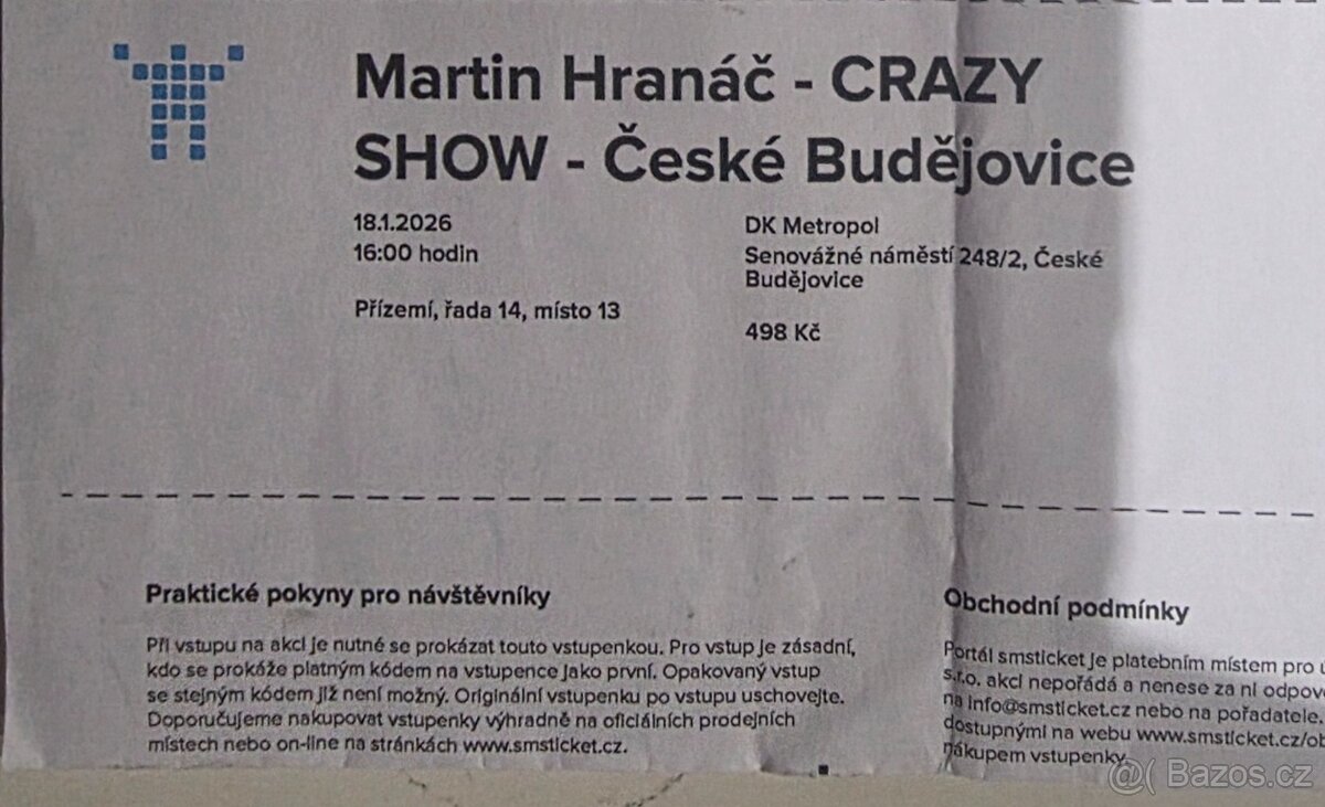 Prodám jeden lístek na Hranáče do Českých Budějovic dne 18.1.26