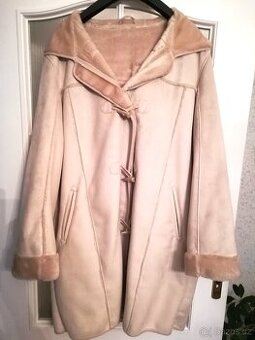 Elegantní zimní kabát, zateplený umělou kožešinou, s kapucí. Velmi jemný materiál. Velikost 48. Perfektní stav. Zapínání na zip i na knoflíky. Rukávy mají kolem obvodu kožíšek.