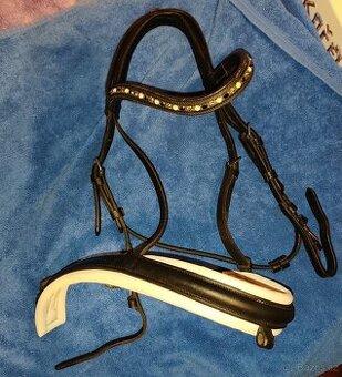Černá, měkká uzdečka s černobílým podložením na nánosníku, čelenka s kamínky + otěže. Zámecká Busse Vel. COB