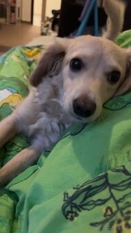Cena: Dohodou. prodám 7 měsíční fenku - kříženec zlatý retrívr x jezevčík, fenka je čipovaná, očkovaná, je chytrá a učenlivá, umí povely sedni, lehni, dej pac, dej pusu, k noze a zůstaň, má rada děti a dokáže být i s kočky, dam k ni pelíšek, šampon+šampon na blechy, hračky, granule