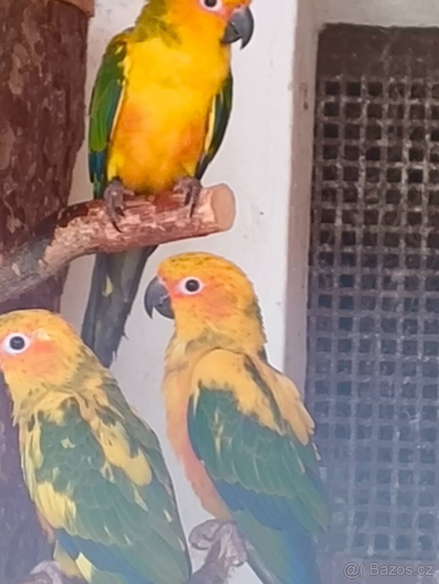 Prodám loňská mláďata Aratinga sluneční ....Odchov pod rodiči ...Kroužkovaný.. S testem DNA... Pouze ,už jen samičky ..Přeštice