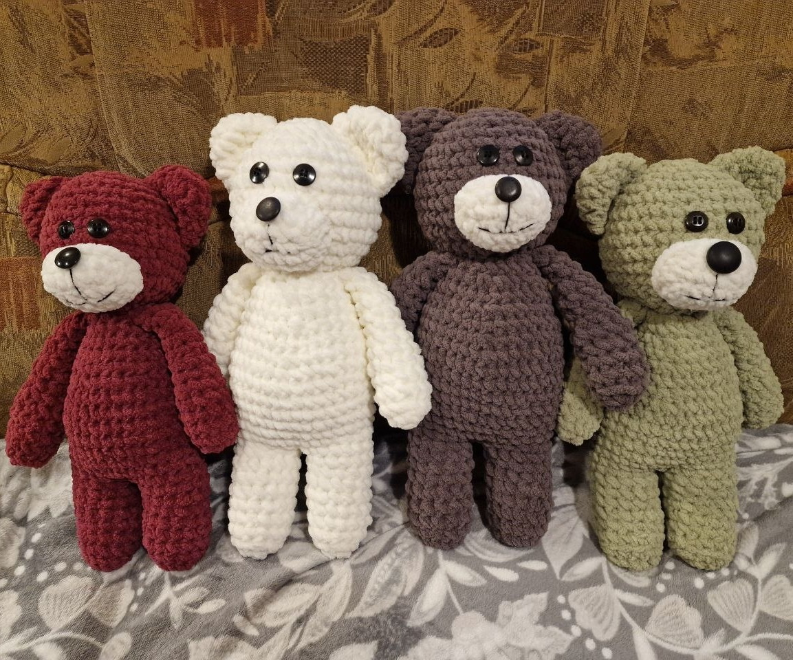Nabízím háčkované medvídky z polyesterové žinylky plněné polyesterovou výplní. Žinylka je velmi jemná, hebká a měkká příze se sametovým vzhledem. Osobní předání v Ústí nad Labem nebo zaslání do Balíkovny/AlzaBoxu za 75 Kč při platbě předem na účet či případně na dobírku při platbě dopravného 94 Kč předem na účet.