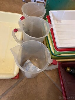 Cena: V textu. Různá velikost Miska 100,- Dvě malé misky 100,- kč Dvě červené žárovky do černé komory, obě 150,- Tři odměrky na chemikalie 150,-