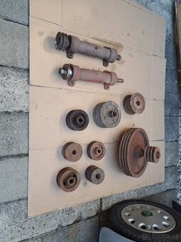 Staré řemenice různých typů a dvě hřídele na cirkulárku... jedné chybí ložiska a krycí víčka... jedna je kompletní. Cena za vše na foto dohromady 3000 Kč