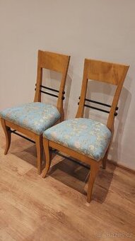 Nabízím k prodeji dvě nádherné, zachovalé židle v elegantním stylu Biedermeier. Ideální pro stylovou jídelnu, pracovnu nebo jako solitérní kousky. * Čalounění: Nové , světle modré s jemným květinovým brokátovým vzorem – velmi dekorativní a pohodlné. * Stav: Výborný stav, ihned k použití. Rozměry 45x90x45 cm. 💰 Cena: 3500 Kč za oba kusy 📍 Místo: Liberec