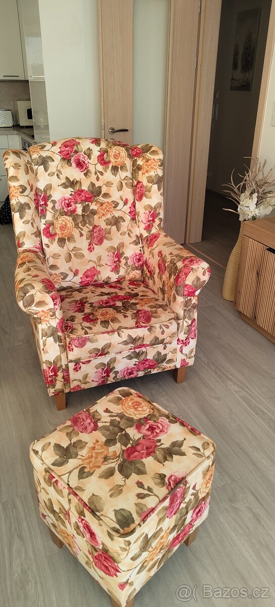 Prodám velmi pohodlné křeslo typu ušák v nádherném květinovém designu, včetně ladícího taburetu (podnožky). Křeslo je ve výborném stavu, v podstatě jako nové, bez známek opotřebení nebo poškození. Kvalitní provedení: Stabilní konstrukce na dřevěných nožkách a pevné polstrování, které se neprosedí. Rozměry: Šířka 90 cm Hloubka 85 cm Výška 110 cm Nosnost do 130 kg Výška sedu 43 cm Taburet: 43x43x45 cm Stav: Top stav (jako nové). Cena: 4000 Kč (při rychlém jednání možná sleva) Místo odběru: Praha
