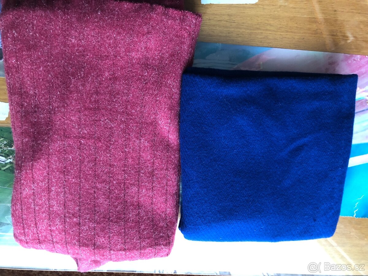 Prodám látku modrý flauš -180kč. Prodám krásnou,jemnou, tmavě červemou pleteninu ze stříbrnou nitkou na šaty ,halenku ,sukni,délka - 185cm. šíře -140cm,cena 275kč.