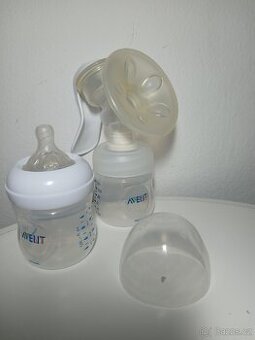 Použitá ruční odsávačka mléka s lahvičkou 125ml. Na některých místech zažloutlá viz foto. Měkká savička pro kohence. Bez pů odního obalu.