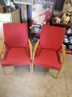 Nabízím krásný zachovalý pár dvou křesílek s kostičkovaným vzorem červeného čalouněni , rovněž pochází z ikonického období československého designu 60. let, období EXPO 58. Čalounění bez poškození, jen potřebuje vytepovat. Opěrky mají standardní opotřebení vzhledem k jejich věku.