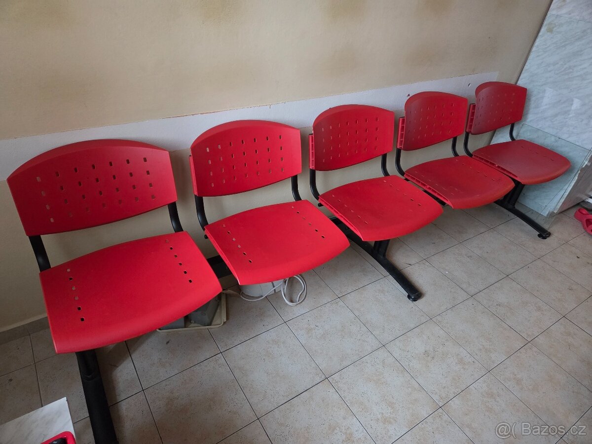 Prodám červené židle do čekárny. Jedná se o trojici a pětici židlí. Staré cca 5 let, nepoškozené, původní cena 35 000.