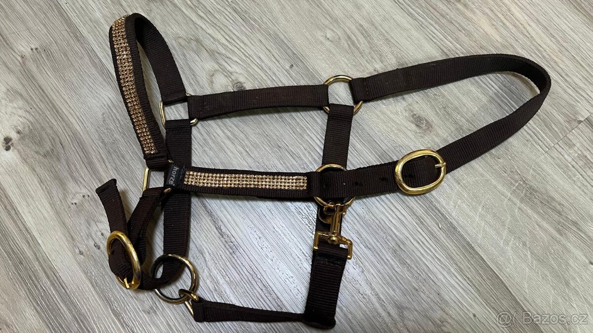 Nabízím nádhernou, úplně novou ohlávku na poníka. Tmavě hnědá se zlatými kamínky na nánosníku a lícnicích, karabinka i očka rovněž ve zlaté barvě. Cena 500,-