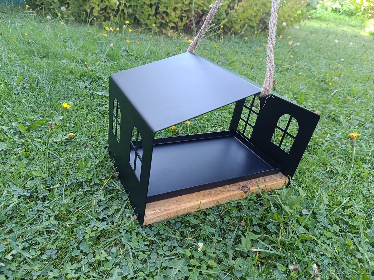Dobrý den, prodám krmítko pro ptáky, zrecyklované masivní dřevo a kov (ocelový plech), natřeno černou matnou barvou. Dřevo ošetřeno olejem. S jutovým lanem na přichycení. Miska je vyndavací. Váha cca 3260g. Ruční práce. š33*h23*v22