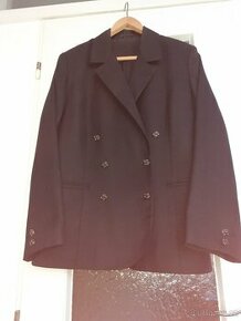 Prodám kostýmek barvy antracitové až černé. Kostýmek je velikosti L až XL s dvouřadovýn zapínáním, šitý na míru. Je z velmi kvalitní vlněné látky, sako i sukně jsou podšité podšívkou. Kabátek=přes prsa asi 107cm, délka rukávu=64cm. Sukně,vzadu rozparek.Pas=92cm,objem přes boky cca 106cm, délka 64cm. Možno koupit jednotlivě, kabátek nebo sukni