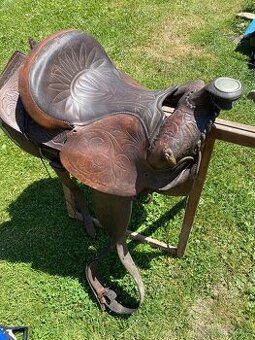 Původní americké sedlo, pro někoho kdo sedla opravuje. Kůže je vysušená , kostra v pořádku. Bohatě zdobené, stříbrné ozdoby. Kostra pevná. Velikost na fotce. Pevná cena. Na požádání zašlu fotky.