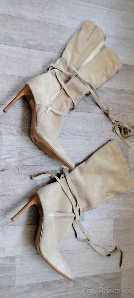Prodám dámské elegantní semišové kozačky, béžové, s efektním šněrováním, velikost 38. Minimálně nošené, super stav.