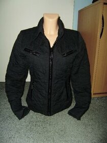 ČERNÁ SLABŠÍ PROŠÍVANÁ BUNDA NA PŘECHODOVÉ OBDOBÍ, ZIP A KAPSY LEMOVANÉ LESKLOU KOŽENKOU, PROJMUTÝ STŘIH. VELMI DOBRÝ STAV, BEZ VADY. ŠÍŘKA PŘES PRSA: 2 x 46 cm, délka: 57 cm, délka rukávu: 62 cm.