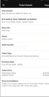 Dobrý den prodám 2 lístky do Mnichova na sezení. Sektor 316 Jsou 2 vedle sebe převod přes TICKETMASTER.piste na WhatsApp